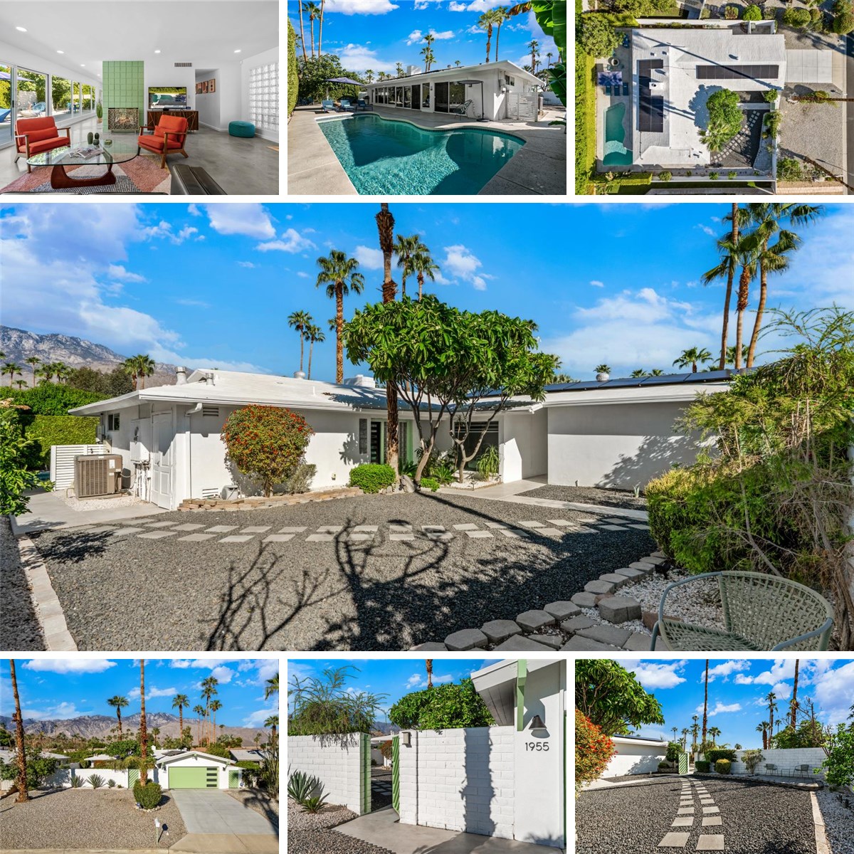 This updated and reimagined Mid-Century modern gem in the highly desirable Tahquitz Creek Golf neighborhood offers fee simple land, bright open interiors, and seamless indoor-outdoor living. Offered turnkey furnished, this home is move-in ready for full-time living, a weekend getaway, or income potential. Step inside to a warm living room with a double-sided fireplace and wall-to-wall glass framing the sparkling pool and lush backyard. Multiple patios, fruit and plumeria trees, a fire pit with mountain views, create the ultimate private retreat. Primary ensuite wing with oversized walk-in closet and rear patio access separated from guest bedrooms and bath on opposite side of the home. The updated kitchen features quartz counters, stainless appliances, and a dual gas/electric convection oven perfect for entertaining from intimate dinners to poolside cocktails. Recent upgrades include new bathrooms, new interior and exterior paint, dry bar with beverage center, a new foam roof, polished concrete floors, modern lighting, 22 solar panels with transferable contract, and an EV charger. This South Palm Springs home is convenient to golf, dining, shopping and everything that makes the desert a paradise for homeowners.