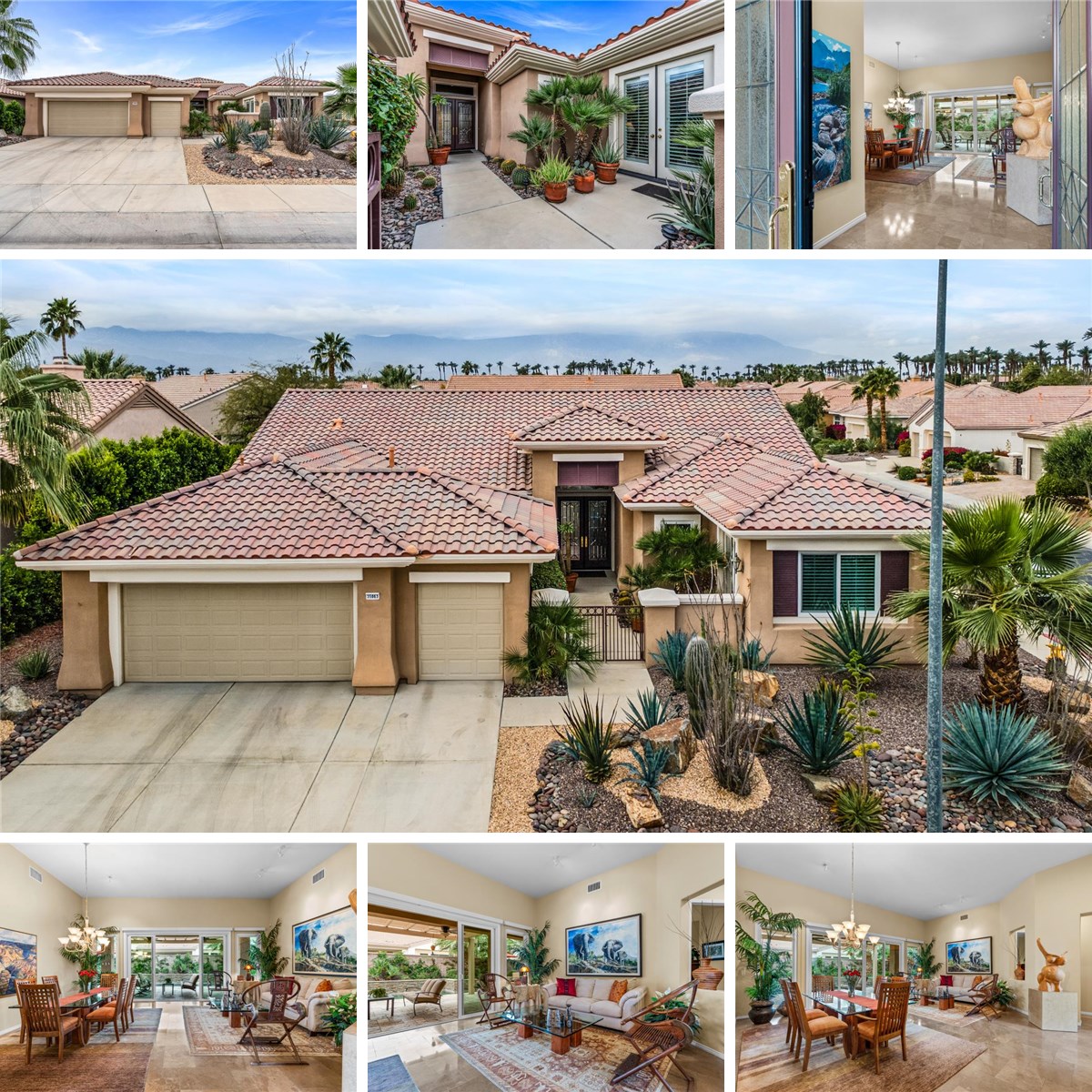 The highly sought-after "Estate Model" Monaco is one of the community's most popular floor plans, offering 3 bedrooms and 3 baths in a thoughtfully designed layout that balances comfort, privacy, and effortless desert living. Ideally situated in one of the most desirable quadrants of the community known for minimal wind and sand intrusion and no freeway noise from the I-10 this move-in-ready residence is just moments from the Lakeview Clubhouse and conveniently close to the dog park, placing premier amenities right at your fingertips. A private attached casita, accessed directly from the front gated courtyard, features its own bedroom, spacious sitting/office area, and bath perfect for guests, extended family, or a private home office. Enter through the charming courtyard and leaded-glass double doors into the elegant great room, where polished Travertine flooring, soaring ceilings, and skylights create a bright, open, and welcoming atmosphere. French sliding doors open to a beautifully designed backyard featuring natural rustic Travertine flooring, an Alumawood pergola with misting system and fans, a sparkling saltwater Pebble Tech pool and spa, outdoor kitchen, and natural gas fire pit creating the ultimate indoor-outdoor lifestyle ideal for both relaxing and entertaining. The well-appointed kitchen showcases granite tile countertops, a large center island, and opens seamlessly to the family room and breakfast nook for easy everyday living and hosting. The spacious primary suite offers a comfortable sitting area with views of the pool and outdoor entertaining spaces, while the generous primary bath features dual vanities, a custom walk-in closet, walk-in shower, and soaking tub for a true retreat experience. Additional highlights include: All-new windows and sliders (2025), Owned and paid-for solar for energy efficiency, 7-year-old HVAC system, impressive laundry room with built-in cabinetry and abundant storage. Extended 2-car garage with mini-split A/C plus dedicated golf cart garage. Kitchen & Garage refrigerator, double oven, dishwasher, microwave, washer/dryer, and outdoor mini refrigerator included to convey with sale. This exceptional home blends comfort, privacy, and resort-style 55+ living in one of the community's premier locations.